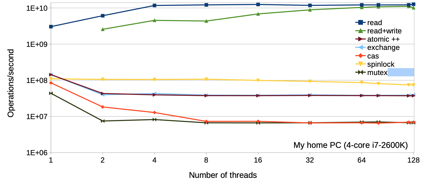程序的性能会随着线程数量线性增长,这可真是简单粗暴的性能提升方法,但是生活并 不总是真么美好, read-only 场景很少,通常出现在科学计算中,更多的场景是 almost read-only。