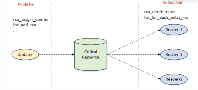 而对应于rcu而言,其中间媒介就是critical resource(可以理解为一个地址), 发布者和订阅 者通过相应的API去操作”中间媒介”.
