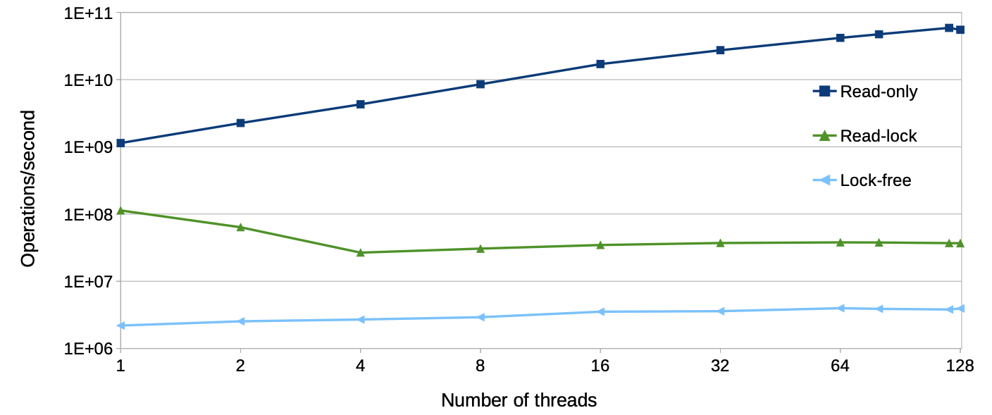 lock-free(list with atomic shared pointers) 虽然是一种比较通用的方案, 其允许 多个写者, 但在read-only 的场景下也会有不小的开销,那在 write-rare的场景下就不太 适用,似乎读写锁更适用一些: